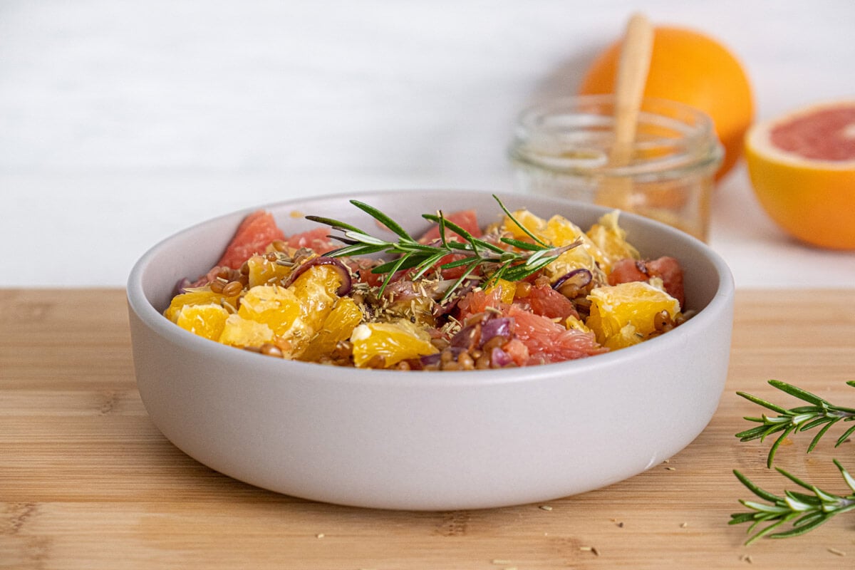 A citrus salad usually includes fresh citrus like oranges or grapefruit, something grounding like greens or grains, and a simple dressing that balances sweet and tangy flavors.